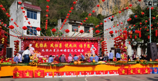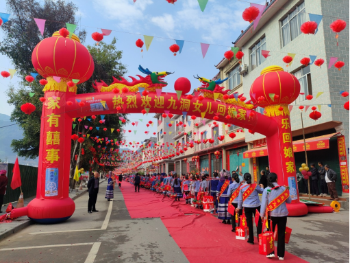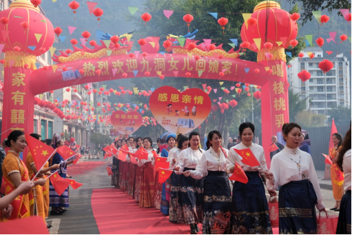 二月初二龍抬頭,百色凌云九洞屯外嫁金花集體回娘家隆重開展?,F場約千人的大聚會,熱烈歡迎外嫁女回娘家。我品現場進行大氣拱門布置,外嫁女舉著溫馨的心形牌,肩上挑著王老吉核桃乳禮盒,開開心心走過紅地毯,熱熱鬧鬧穿過拱門?,F場人流聚集,核桃乳品牌形象高頻露出,宣傳效果較好。