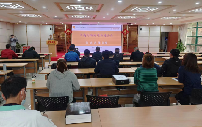為全面深入普及勞動法知識,加強來穗務工人員保護自身合法權益觀念,營造良好的法治氛圍,江高鎮司法所合作律師江見華在會上以案說法,從管理層與被管理層兩個角度分析了調崗、曠工、工傷三個方面可能涉及的法律問題,培訓過程中,公司員工積極提問、踴躍發言,江律師一一耐心解答群眾關于勞動合同、工傷認定等與員工利益密切相關的專業問題,整個課堂營造了濃厚的活躍氛圍。