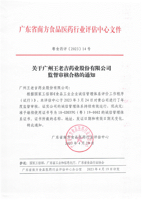 王老吉藥業(yè)再次通過食品誠信體系認(rèn)證