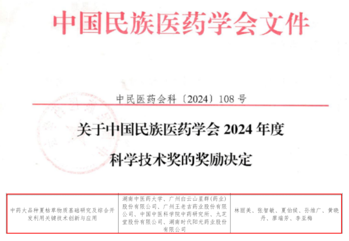 由中國民族醫藥學會主辦的中國民族醫藥學會2024年學術大會在北京召開,共計74項成果獲中國中國民族醫藥學會2024年度科學技術獎,其中,王老吉藥業與湖南中醫藥大學、廣州白云山星群(藥業)股份有限公司、中國醫院科學院中藥研究所、九芝堂股份有限公司、湖南時代陽光藥業股份有限公司聯合承擔的“中藥大品種夏枯草物質基礎硏究及綜合開發利用關鍵技術創新與應用”項目榮獲中國民族醫藥學會科學技術獎三等獎。 -