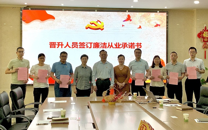 王老吉藥業組織召開2023年晉升人員任前廉潔談話會議,公司黨委書記陳偉平,黨委副書記、工會主席何毅,紀委書記李玉婷對2023年上半年12名新晉升人員進行任前廉潔談話 -
